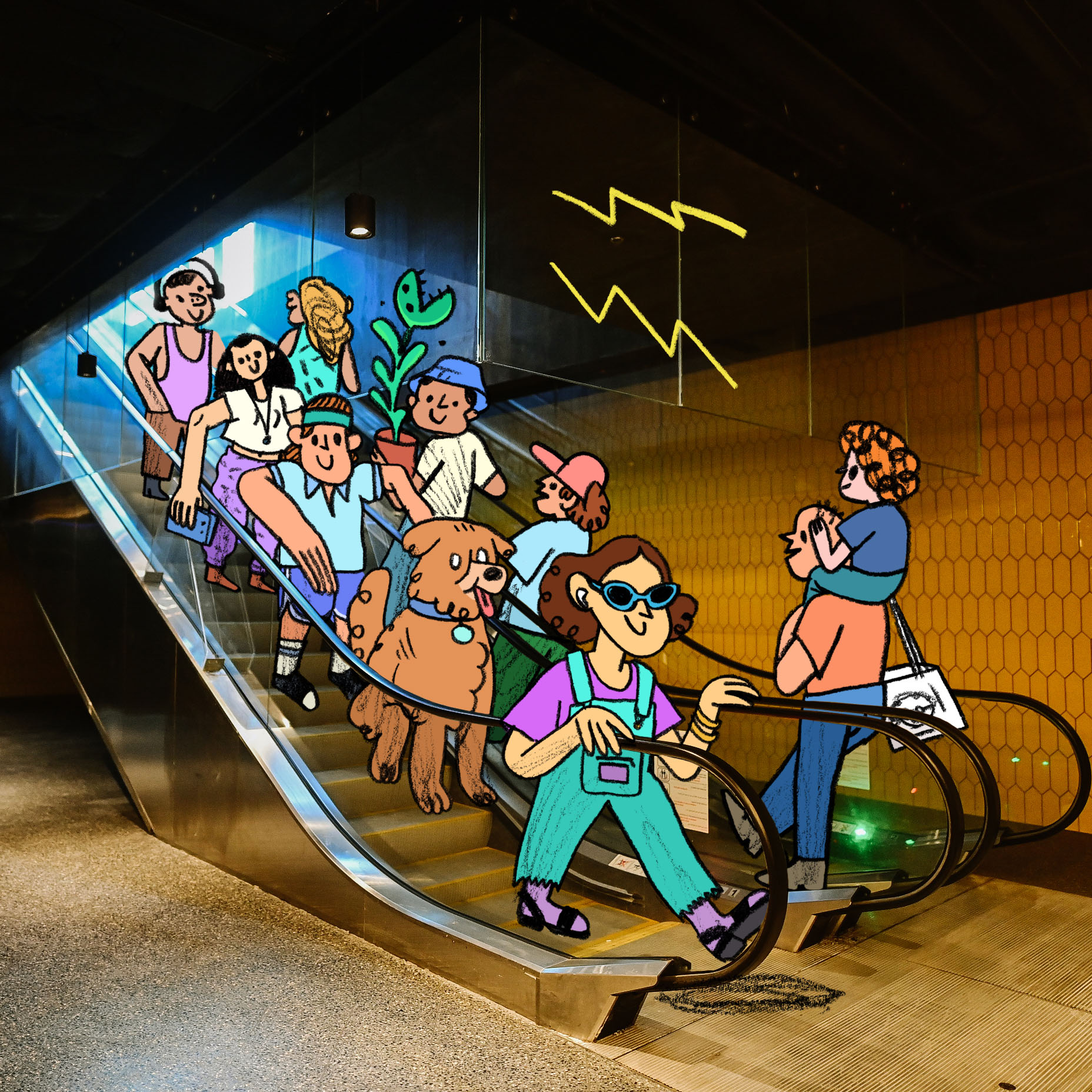 Illustrations over promotional photos.