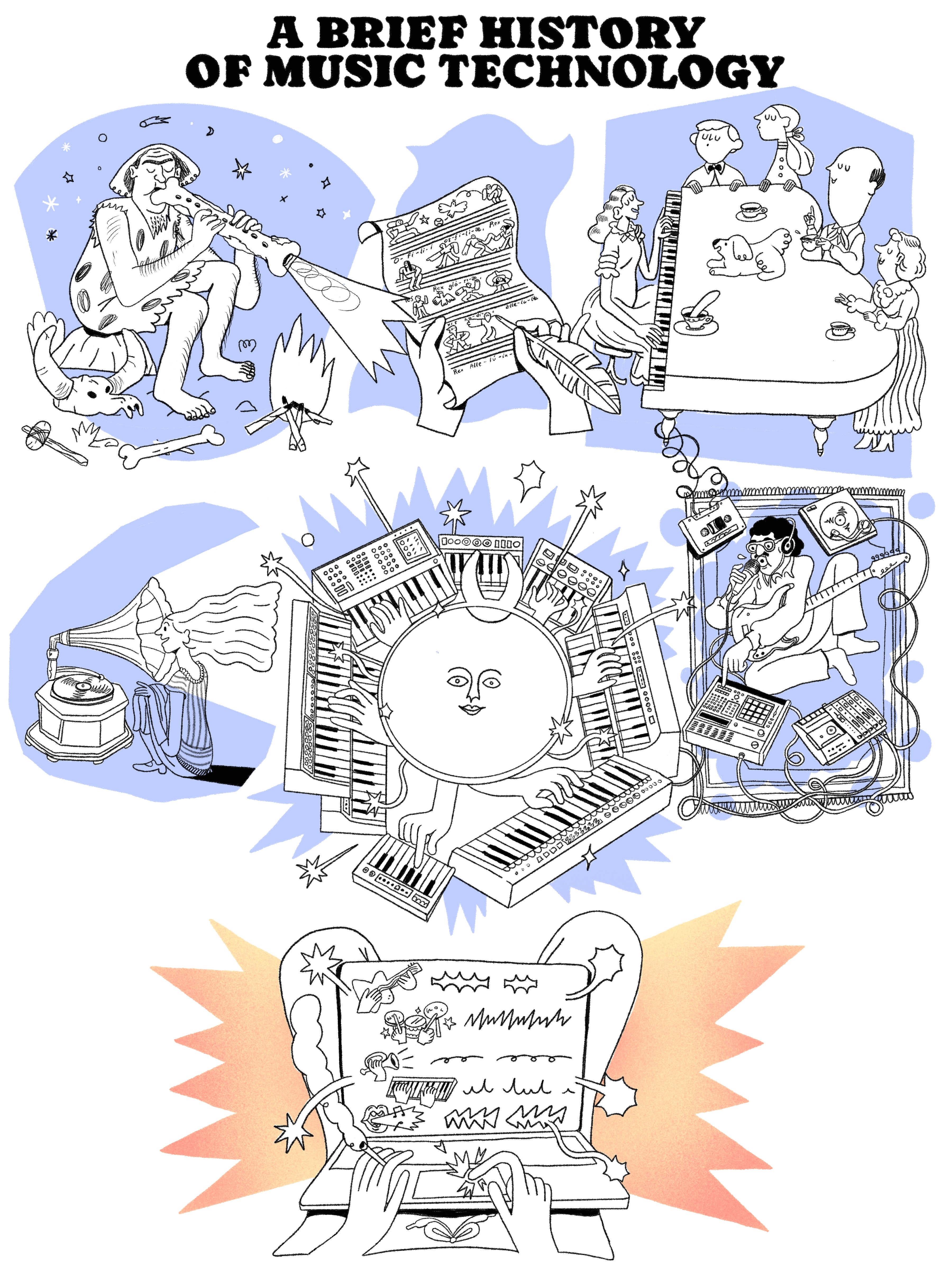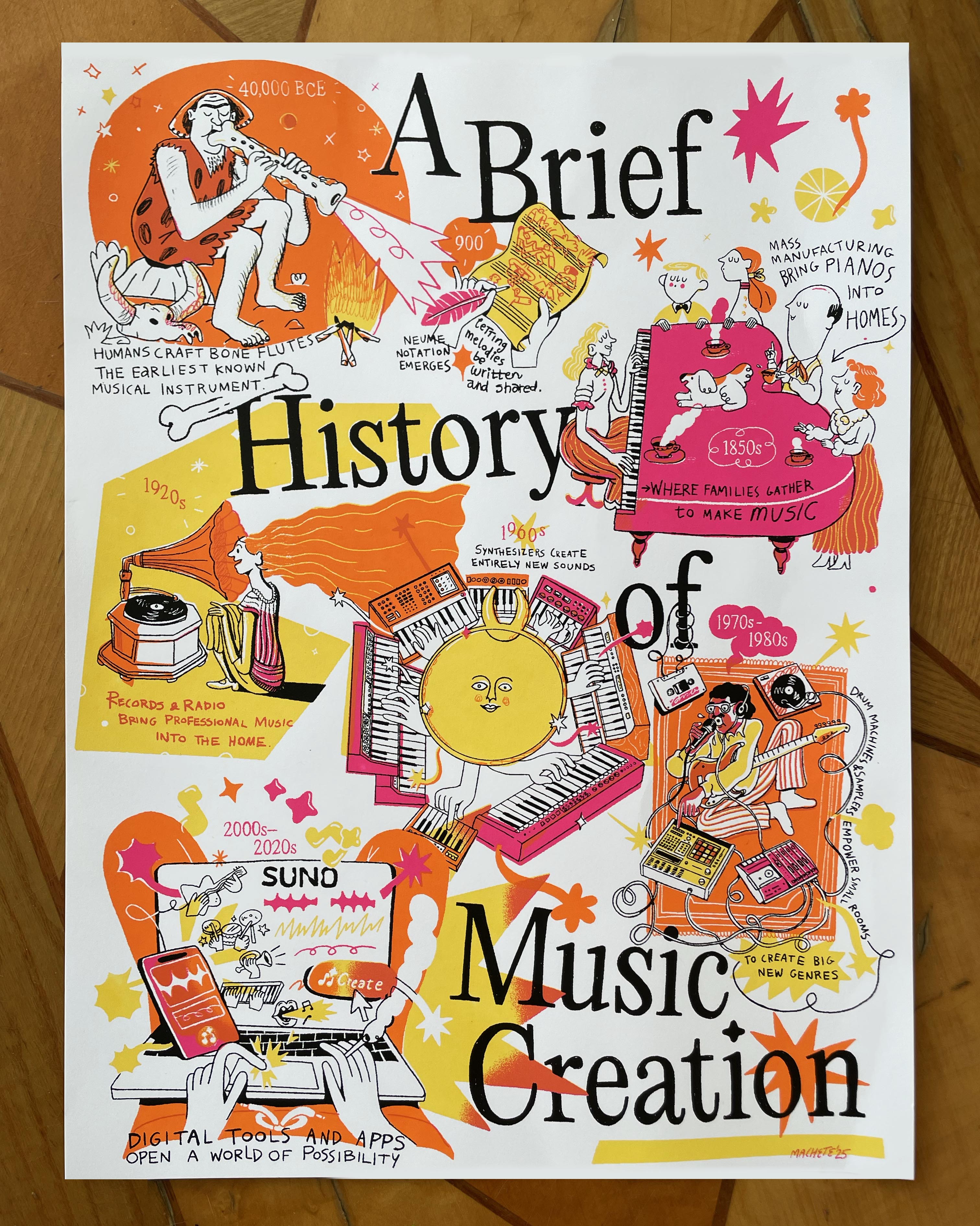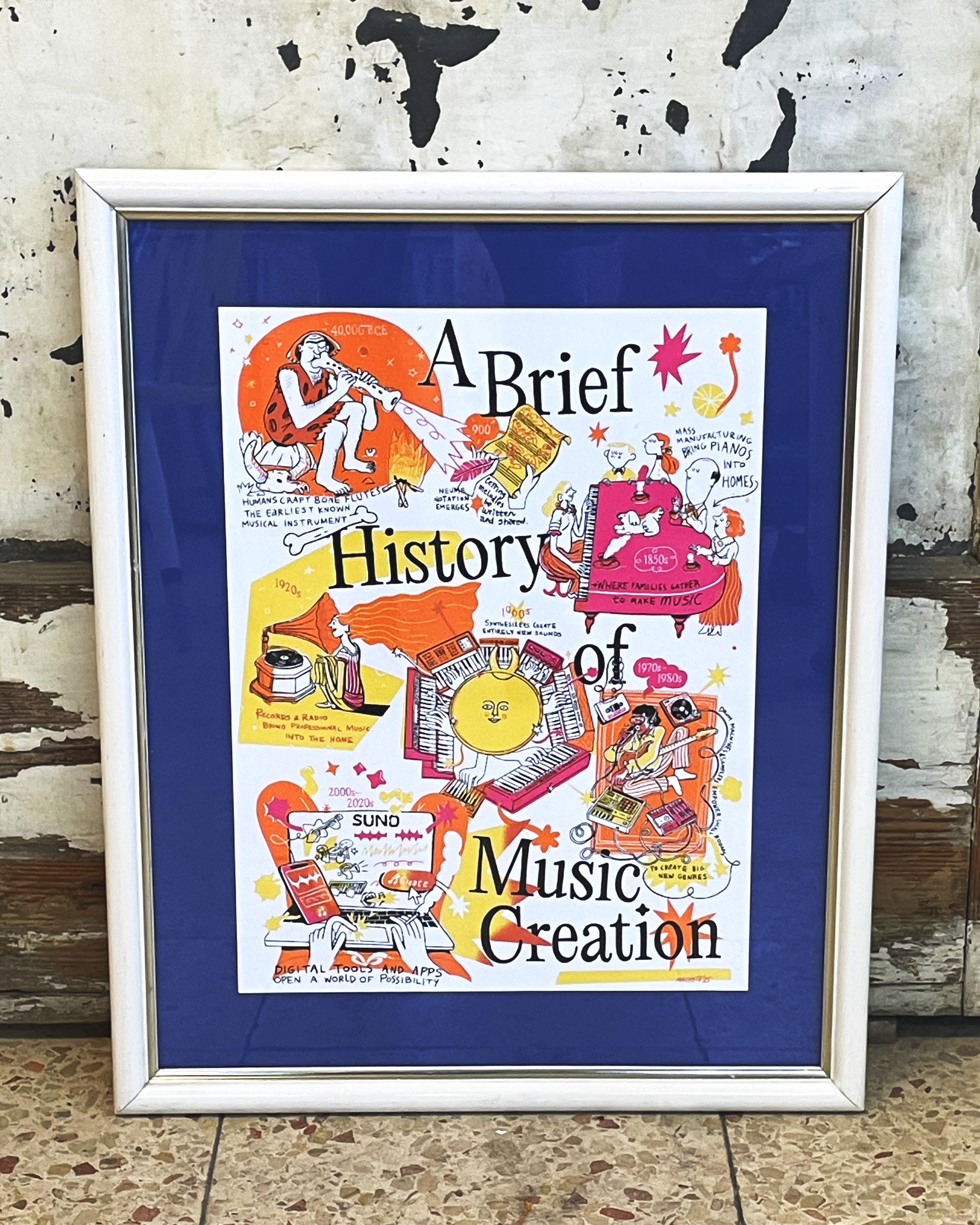 The Poster features anchorpoints in the development of music creation technologies, starting with the earliest musical instruments of the neanderthals, and ending with AI-computer collaboration: