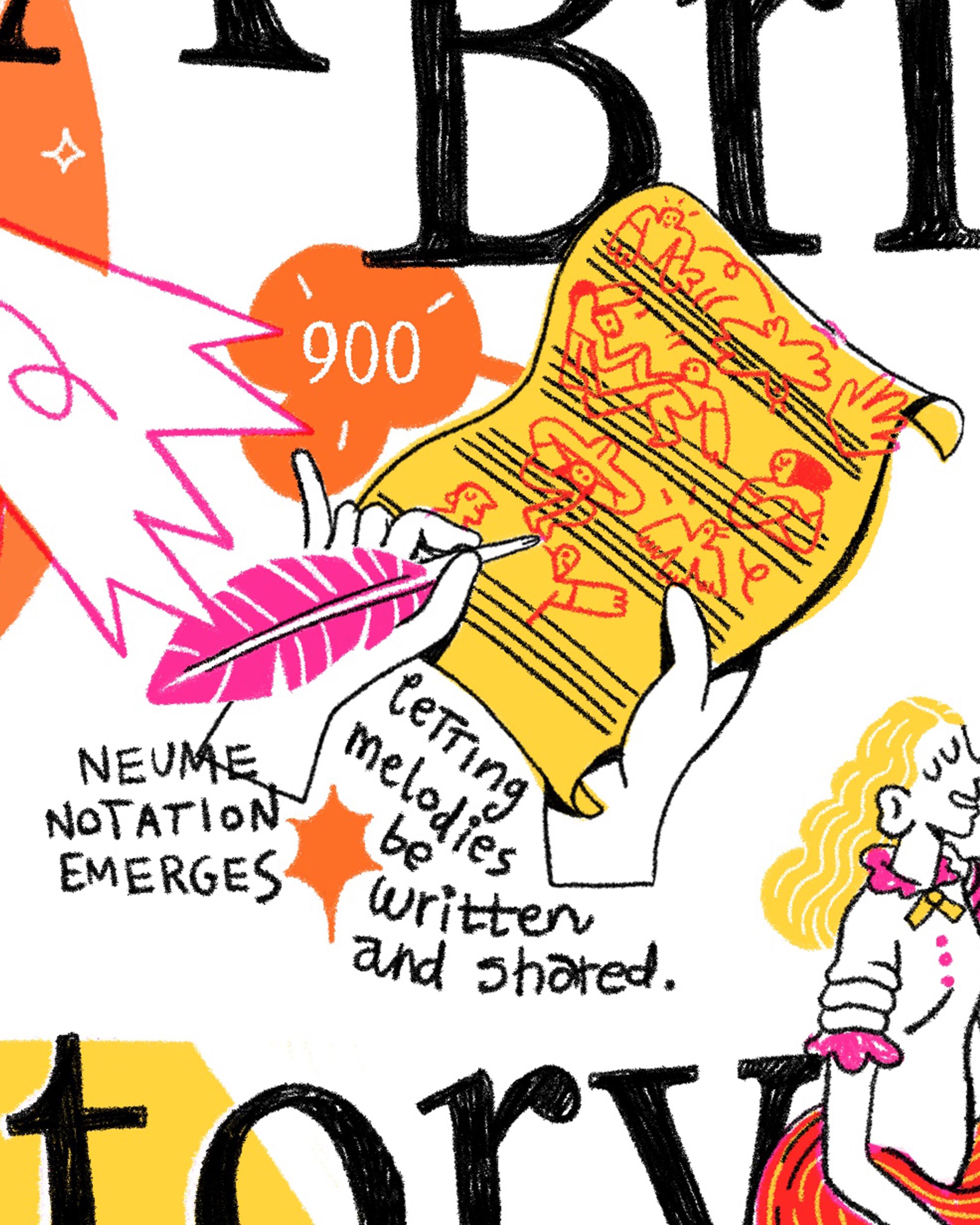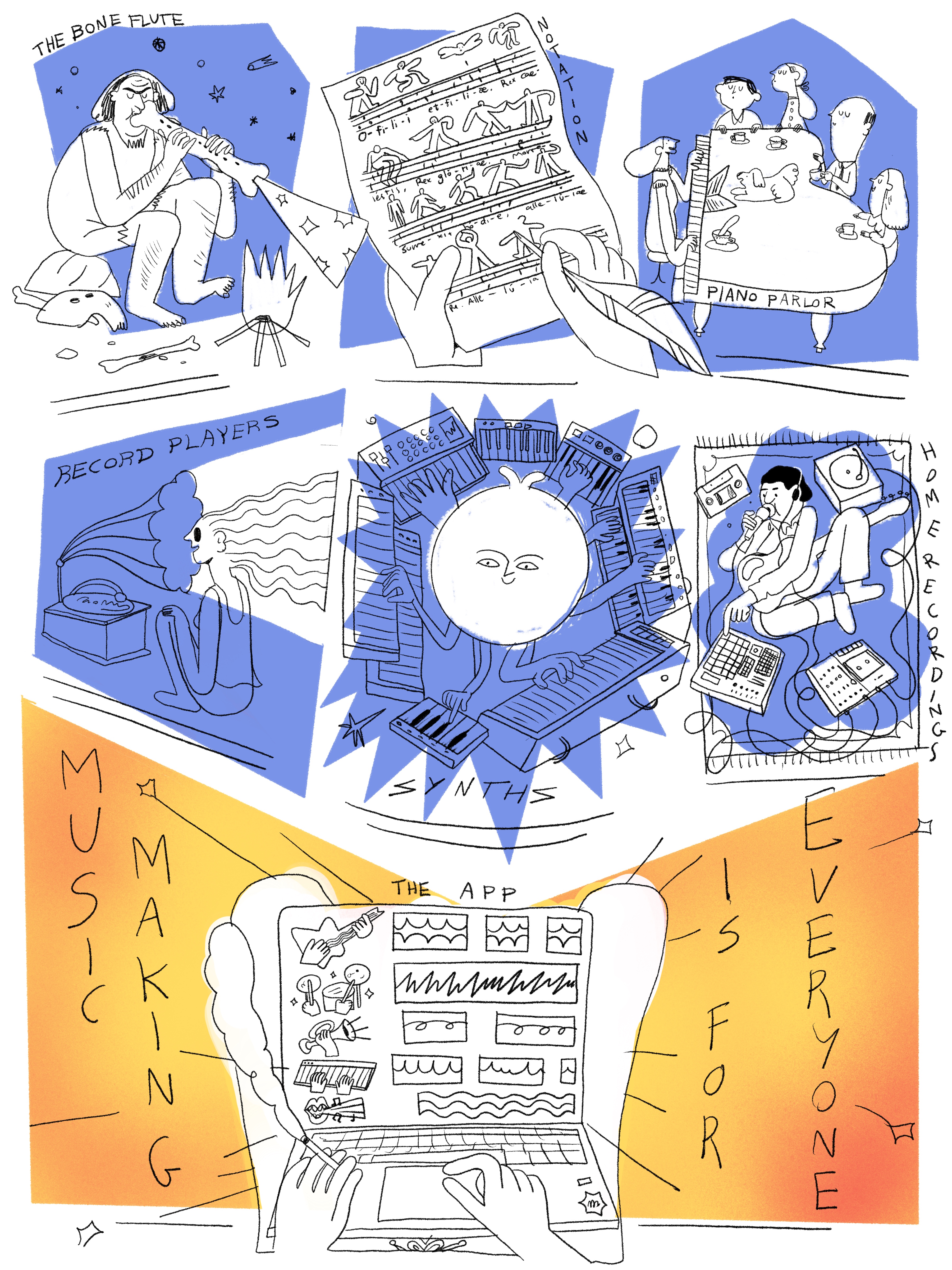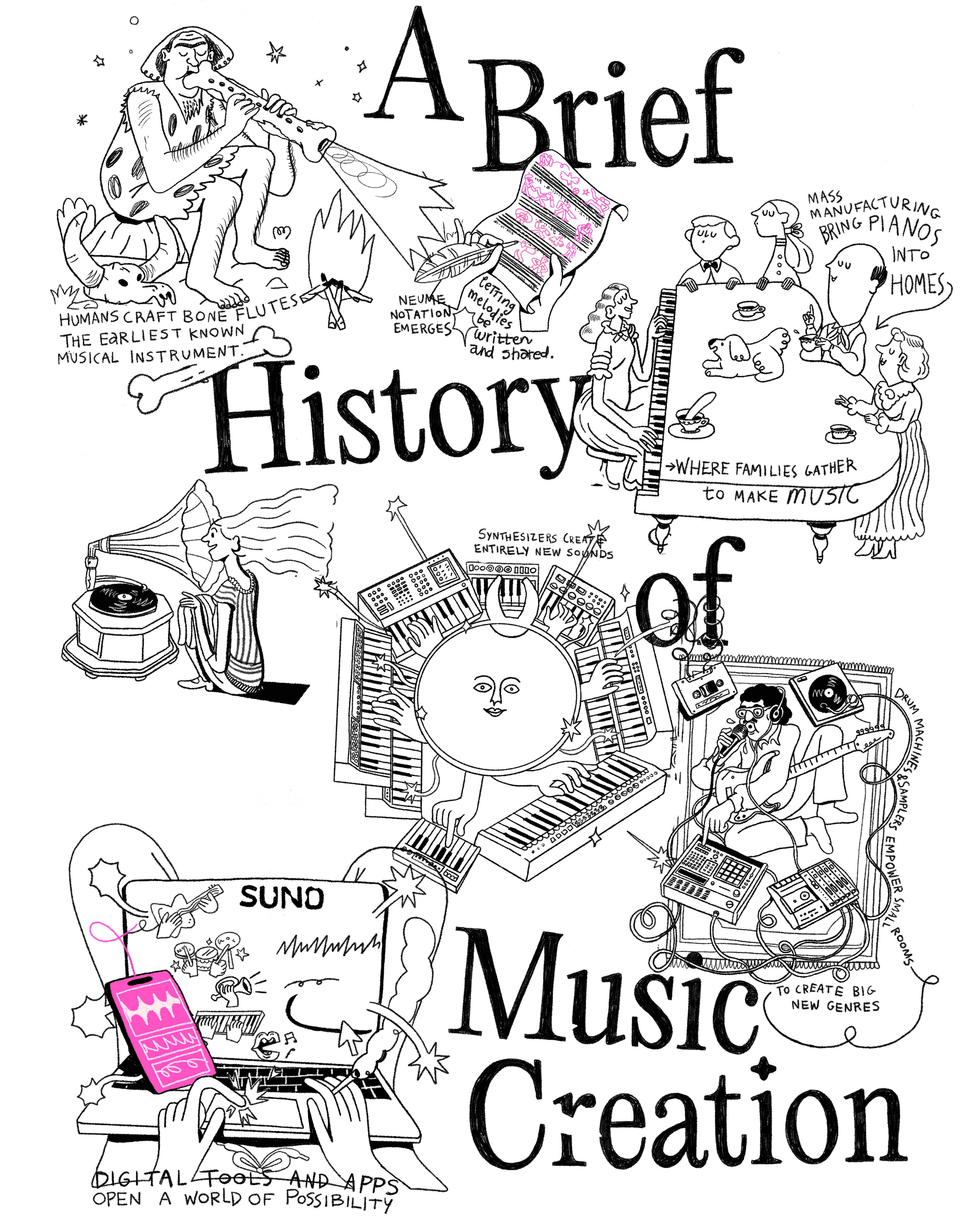 The Poster features anchorpoints in the development of music creation technologies, starting with the earliest musical instruments of the neanderthals, and ending with AI-computer collaboration: